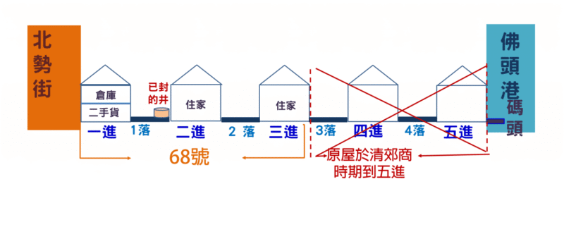 這間外觀是洗石子的老屋,前屋主姓張,與隔壁70號是兄弟,經營布工坊,72號到76號則是染坊,為了方便進出,這些房子原本都有挖出拱門來互通,是許多原本就住在神農街住民童年對神農街的印象。周老闆說當初他就是向賣布的張先生買房子,但是隔壁70號五條港發展協會較晚搬來,並不是向張氏兄弟購屋,而是已易主從事裝璜工作的屋主。老屋原本也該是五進,但是到周老闆來此居住時只剩下三進而已。老屋同其他神農街的房子一樣,在一進與二進天井的位置有口井,周老闆入住時井就已用蓋子封住。
