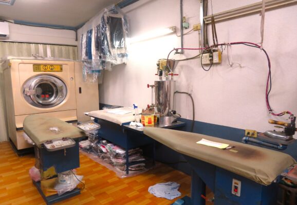 金和老闆說有一天跟老闆出門巡廠房,巧遇以前的學徒,學徒改開洗衣店,就問金和老闆要不要改作洗衣店,可以介紹金和老闆哪裡買設備,因而踏上洗衣的人生。選擇民權路開洗衣店,主要是過去經營成衣工廠就在海安路上,對周遭的熟悉與情感,自然而然選擇了目前的現址民權路三段146號開店。為了開洗衣店還跟岳父借了資金購買了三台專業洗衣機,以及一些設備,就在兒子二歲時搬進來,直到現在已經三十一年了!當初巧遇學徒轉行作洗衣店,學徒直說會傳授洗衣技術,卻只有嘴巴講講而已。大家都很好奇金和老闆可有去拜師學藝?金和老闆自信滿滿直說不需要,憑藉年輕時期成衣工廠,每每去看布料怎麼選與下訂單的經驗,對布料已經暸若執掌,不管特性、材質、織法等等,都非常的熟識,這幫助了金和老闆針對布料用對藥物洗劑,自然所有的髒污都難不倒他。