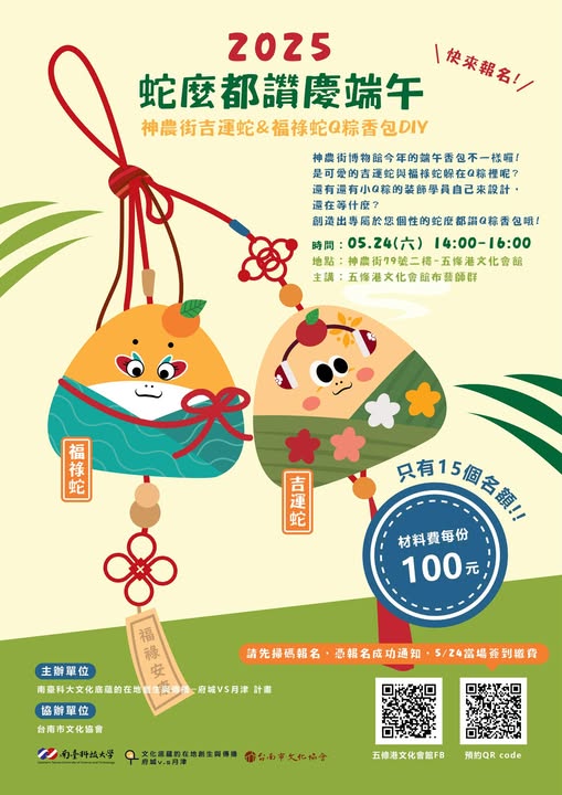 #端午節 #香包DIY #神農街活動 #台南手作課程 #文化創生 #五條港文化會館 #南臺科技大學 #蛇麼都讚 #吉運蛇 #福祿蛇 #Q粽香包 #親子活動 #傳統文化 #台南端午 #台南