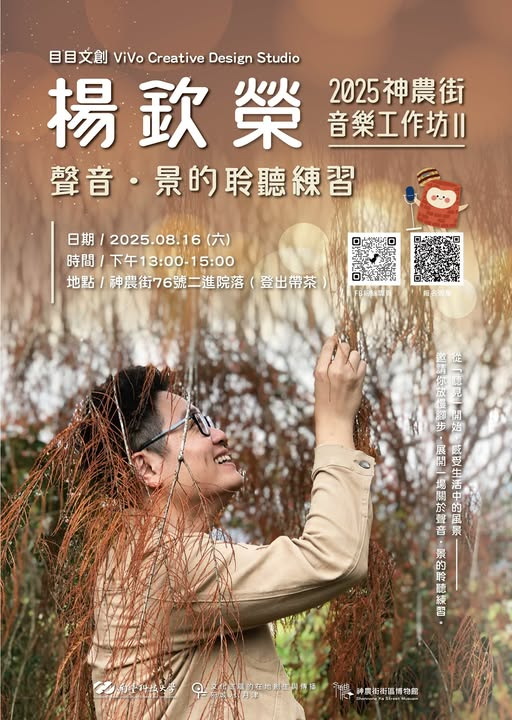 本次工作坊邀請到目目文創ViVo Creative Design Studio楊欽榮總監擔任講師,將帶領大家進行一場聲音與環境的聆聽練習,從自然環境到人造聲響,透過觀察與聆聽,重新認識生活中各種聲音的存在,感受聲音如何影響我們對空間與情緒的感知。