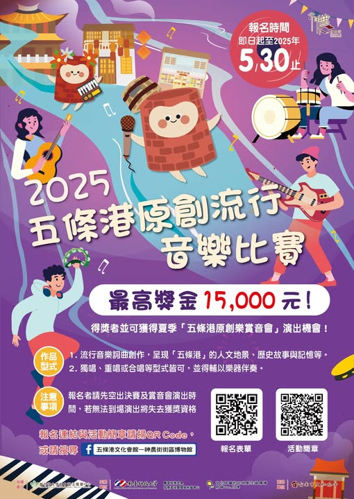 」金曲歌王謝銘祐創作的「 #五條港邊 」,生動譜寫五條港的特色與地方記憶,輕快旋律搭配琅琅上口的歌詞,成為了五條港經典歌曲!而你所知的五條港又是什麼樣子呢?快投稿報名「2025五條港原創流行音樂比賽」,下一首人人傳唱的五條港經典歌曲等你創作