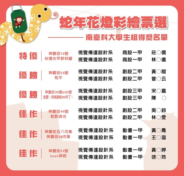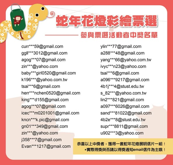 得獎名單請見圖示,恭喜得獎者獲得南臺科大學生設計的蛇年花燈展明信片一組 ( 10張 )