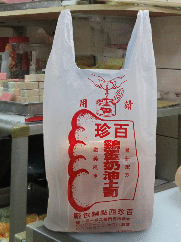 ▲百珍西點麵包廠以招牌品項雞蛋奶油吐司作為塑膠袋圖案